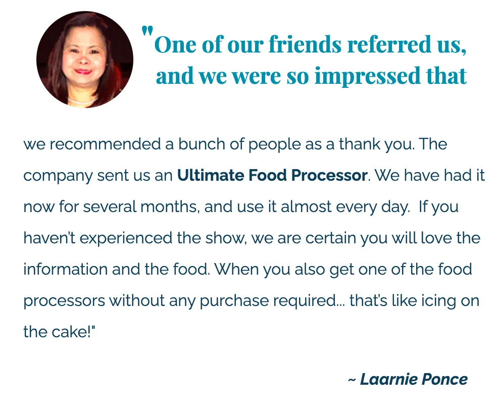 There is no catch. Our hope is you’ll learn something new about how great meals are made — and maybe you’ll want to share the experience with your friends and family. The food processor is a token of our gratitude for giving us the opportunity to spread awareness about Saladmaster. In regards to cost, the cooking show is 100% FREE. All we ask is that you cover the food & transportation expenses which is a very small fee.